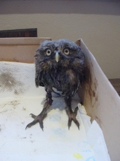 The owl’s feathers were heavily contaminated with engine oil, preventing normal flight and insulation. Careful cleaning and rehabilitation were carried out to remove the contamination and restore feather condition.