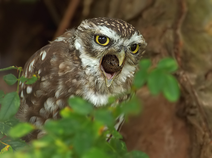 A wild Little Owl coughing up or regurgitating an Owl Pellet