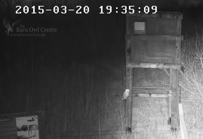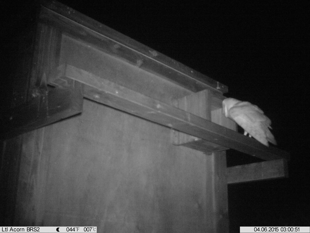 Barn Owl Manor at night with a Barn Owl just about to enter.