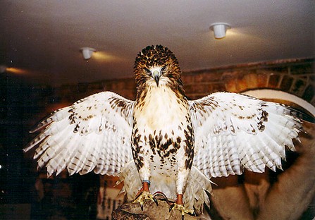 Red Tail Hawk (Captive Bred) Here shows extensive damage to wing & tail feathers. Handed to us as an unwanted bird, which was not kept properly by the keeper.