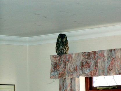 Wild Tawny Owl sat on the curtains after falling down someones chimney. Safely re-released back to the wild.